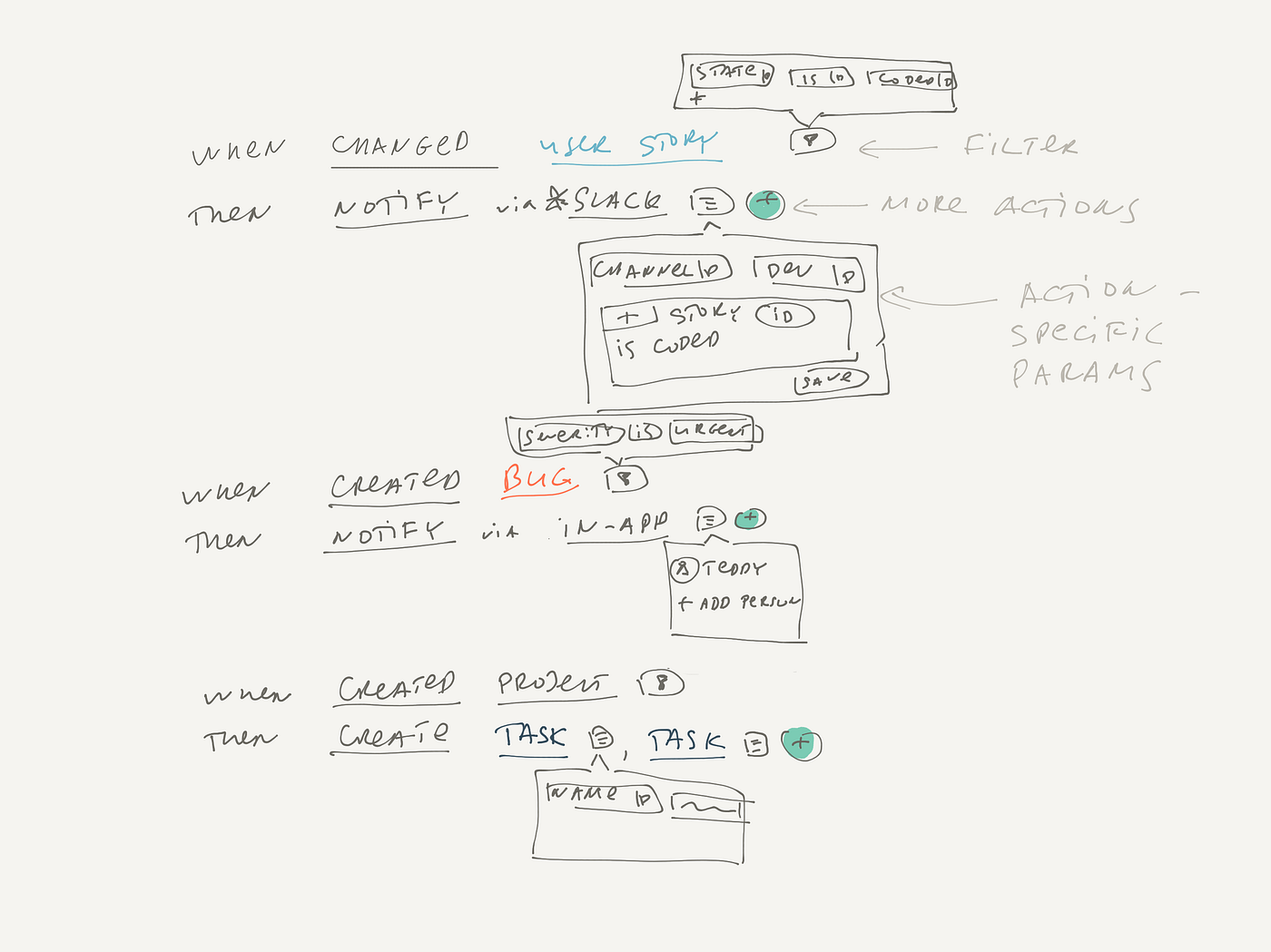 - It seems WYSIWYG approach with some real-time feedback (check Bret Victor ideas) is a way to go for mere mortals. Still flow visualization is hard. We should try to help people with visual queues, current state visualization, etc. We should augment human thoughts and help them penetrate rules creation barrier. For example, user can provide some sample data and on every step we can show how this data looks.
